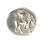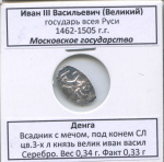 Денга. Иван III Васильевич (Великий) государь всея Руси 1462−1505 г. г. Московское государство. Всадник с мечом, под конем СЛ. Серебро. Вес 0,34 г. Факт 0,33 г. В холдере