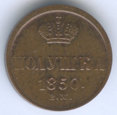 Полушка (¼ копейки) — Вензель Николая I 1850 ВМ. Кабинетная патина. Довольно редкая (Российская Империя)