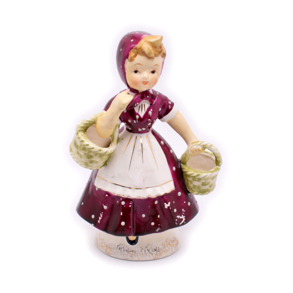 Фарфоровая статуэтка «Девушка в бордовом платье в горошек с двумя корзинами». Размер 11×17 см. Без клейма