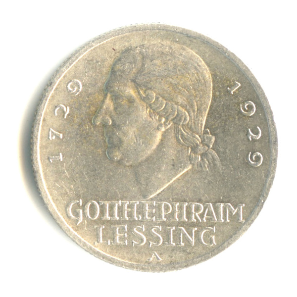 3 рейхсмарки — 200 лет со дня рождения Готхольда Лессинга A (Юбилейная монета) 1929 A (Германия)