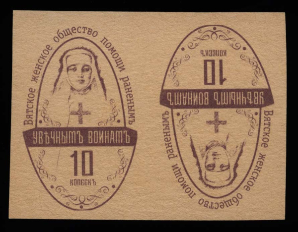 10 копеек — «Вятское женское общество помощи раненым.» Марка непочтовая благотворительная. Тет-беш. Первая Мировая война. 1914−1916 1914-1916 (Российс…