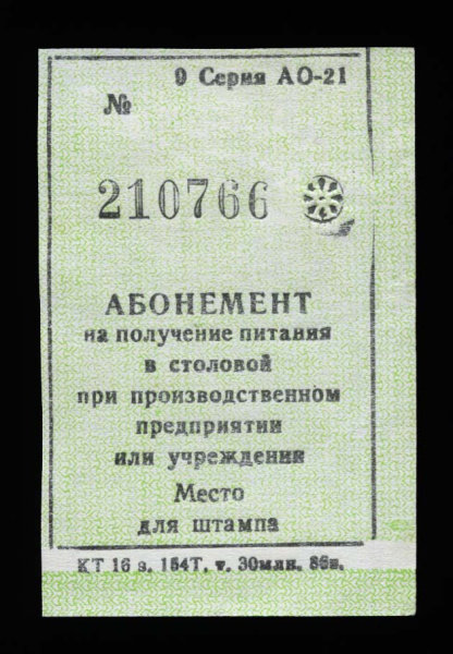 Абонемент на получение питания в столовой. Днепропетровск 1986 (СССР)