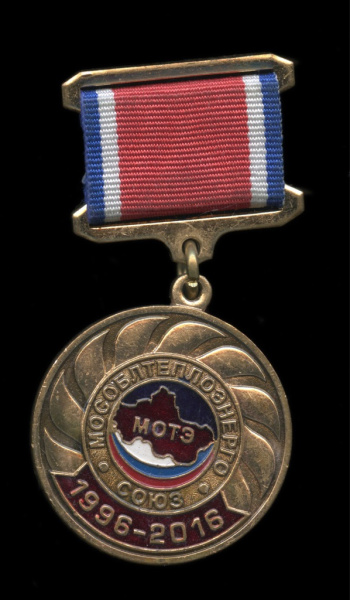 Медаль «20-летие сотрудничества между Московским отделением тепловых сетей (МОТЭ) и профсоюзом „СОЮЗ“». Крепление: булавка. Тяжелая, эмаль (Россия)