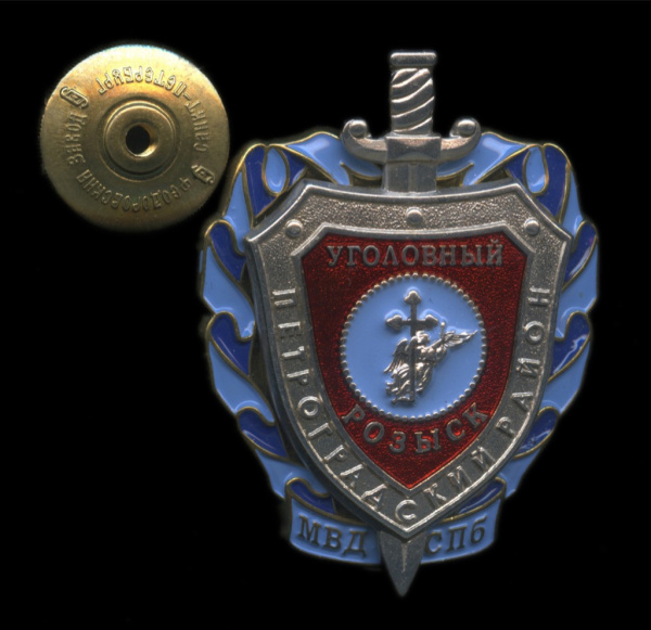 Знак «Уголовный розыск Петроградского района. МВД CПБ». Крепление: винт. Тяжелый, эмаль (Россия)