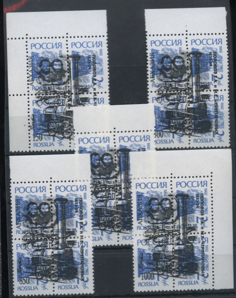 Лот почтовых марок. 1992 г. Локальный выпуск. Надпечатка на Стандартах СССР. Абхазия. Местные выпуски. Квартблоки. 5 штук. Состояние **. Чистые (Без н…