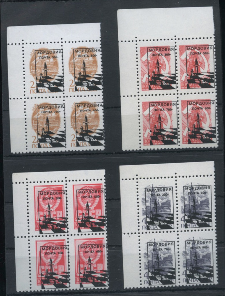 Лот почтовых марок. 1992 г. Локальный выпуск. Надпечатка на Стандартах СССР. Мордовия. Местные выпуски. Квартблоки. 4 штук. Состояние **. Чистые (Без…