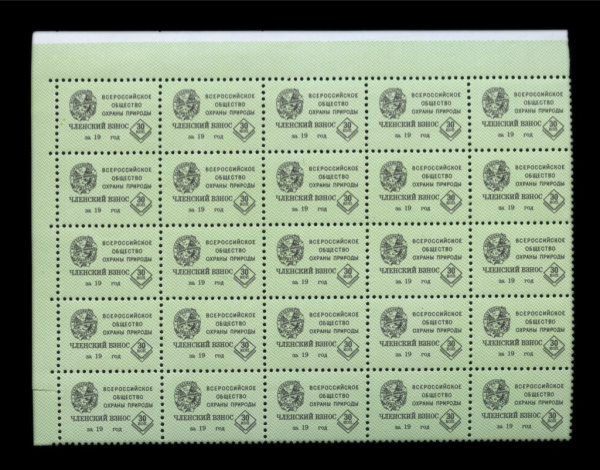 Лот непочтовых марок. 1970-е. СССР. Членский взнос. Всероссийское общество охраны природы. Номиналом 30 коп. Угловой Блок. Состояние **. Чистая (Без н…