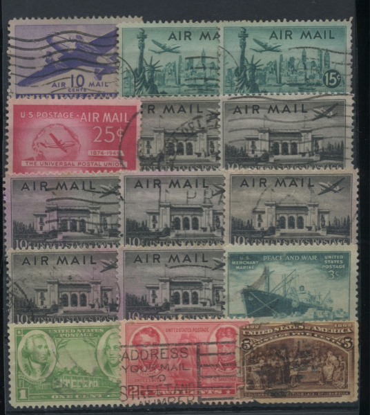 Лот почтовых марок. 1940 г.-1950г. Авиация. Самолёты. Архитектура. Авиапочта. Разновидности. Гашёные. 15 шт 1940−1950г 1940-1950г (США)